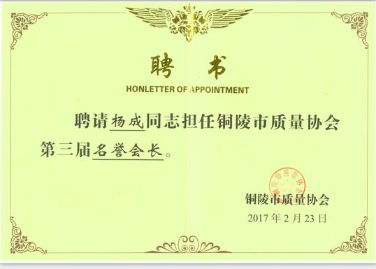 2017年2月末市質(zhì)量協(xié)會聘請董事長楊成先生,擔(dān)任銅陵市質(zhì)量協(xié)會第三屆名譽會
