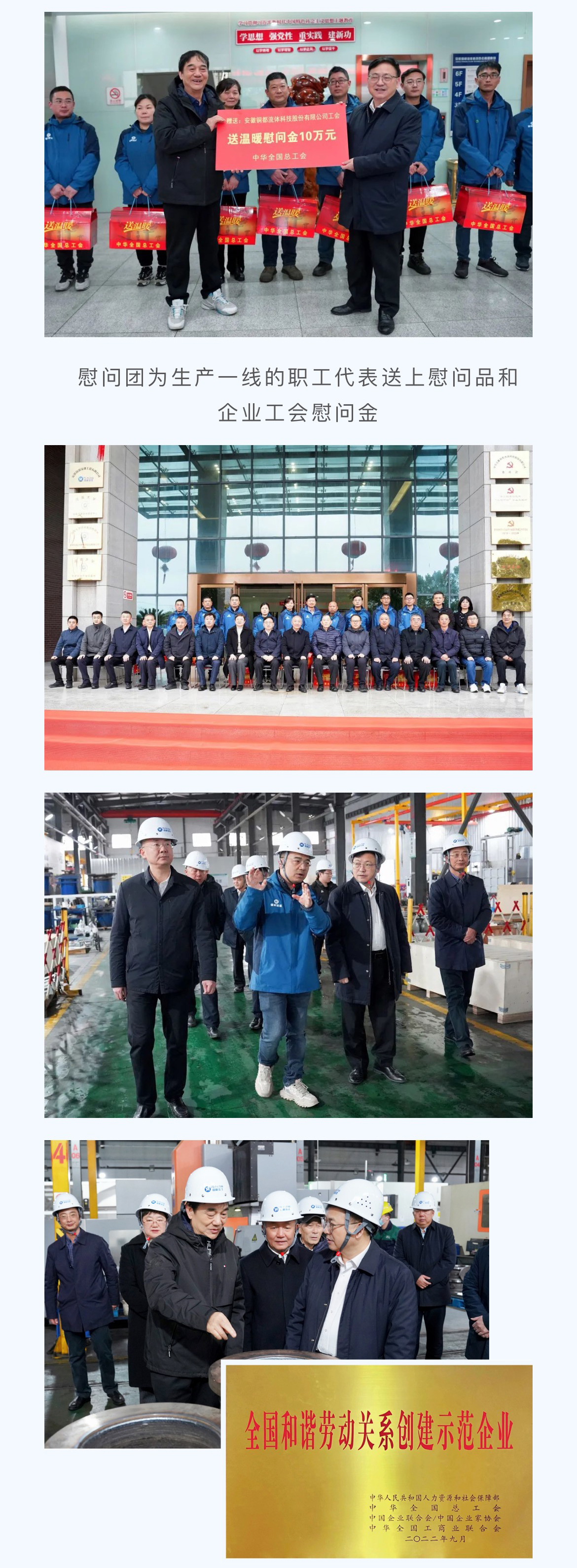 慰問團(tuán)一行對銅都流體獲得“全國和諧勞動關(guān)系創(chuàng)建示范企業(yè)”榮譽作出充分肯定,并在董事長楊成、總經(jīng)理楊凌杰陪同下,前往生產(chǎn)現(xiàn)場,看望奮戰(zhàn)在生產(chǎn)一線的職工代表,為他們送上慰問品和企業(yè)工會慰問金,詳細(xì)了解企業(yè)生產(chǎn)經(jīng)營和工會工作情況,指出企業(yè)工會組織要切實發(fā)揮作用,圍繞企業(yè)生產(chǎn),積極開展各類勞動競賽和技能素質(zhì)提升活動,為職工的成長成才搭建廣闊舞臺,鼓勵廣大職工要充分發(fā)揮工人階級主力軍作用,用辛勤的勞動創(chuàng)造美好的生活,為推進(jìn)中國式現(xiàn)代化貢獻(xiàn)自己的力量。