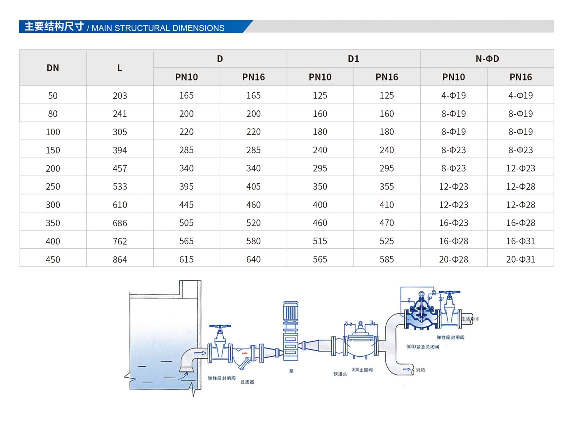 900X緊急關(guān)閉閥,是一種用于消防用水與生活用水并聯(lián)的供水系統(tǒng)中,用來調(diào)配供水方向的閥門。當(dāng)火災(zāi)發(fā)生時,消防急需大量用水,900X緊急關(guān)閉閥立即切斷生活用水,確保足夠的消防用水:當(dāng)消防停止用水壓力減小時,閥門自動打開,呈常開狀態(tài),恢復(fù)生活供水。該閥使系統(tǒng)無須另設(shè)專門的消防單獨(dú)供水管網(wǎng),大大地節(jié)約了建設(shè)成本和用水量。閥門控制靈敏度高,安全可靠,調(diào)試簡便,使用壽命長。